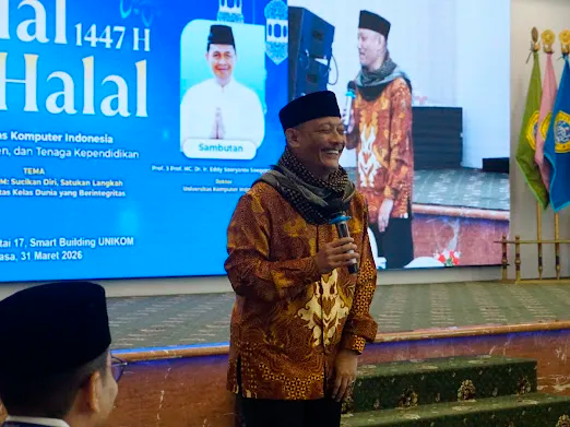 BANDUNG, UNIKOM — Dalam suasana penuh kehangatan dan kebersamaan pasca-Ramadan, Universitas Komputer Indonesia melaksanakan kegiatan Halal Bihalal 1447 Hijriah pada Selasa, 31 Maret 2026, dengan mengusung tema “Harmoni UNIKOM: Sucikan Diri, Satukan Langkah Menuju Universitas Kelas Dunia yang Berintegritas”.Rektor UNIKOM sekaligus Ketua APTISI Jawa Barat, Prof. 3 Prof. HC. Dr. Ir. Eddy Soeryanto Soegoto, M.T., hadir didampingi Pembina Yayasan Ilmu Pengetahuan & Teknologi (IPTEK) Dra. Hj. Ani Astuti, S.E., beserta jajaran Wakil Rektor, para Dekan, Direktur, Ketua Program Studi, dosen, dan seluruh sivitas akademika UNIKOM. Selain itu, hadir pula jajaran pimpinan BNI Kantor Cabang/Wilayah Dago. Bertempat di Auditorium Lantai 17 Smart Building UNIKOM, momentum Halal Bihalal menjadi wadah strategis untuk mempererat tali silaturahmi sekaligus memperkuat nilai-nilai kebersamaan di lingkungan kampus.Rektor UNIKOM sekaligus Ketua APTISI Jawa Barat, Prof. 3 Prof. Dr. Ir. Eddy Soeryanto Soegoto, M.T., mengawali sambutannya dengan mengajak seluruh sivitas akademika UNIKOM untuk turut mendoakan kesehatan Ketua Yayasan IPTEK, Hj. Lasmaya Oli’i yang tengah menjalani perawatan di Rumah Sakit, semoga diberikan kesehatan oleh Allah SWT. Prof. Eddy berharap doa dari seluruh keluarga besar UNIKOM dapat menjadi kekuatan serta membawa kesembuhan bagi Ibunda.Lebih lanjut ia menyampaikan refleksi perjalanan panjang UNIKOM sejak berdirinya pada 8 Agustus 2000 hingga saat ini. “Perjalanan panjang ini tentunya tidak terlepas dari kontribusi dan kerja keras seluruh pimpinan, dosen, tenaga kependidikan, serta dukungan berbagai pihak. Berbagai capaian, termasuk peningkatan akreditasi program studi dan pengakuan di tingkat internasional, merupakan hasil sinergi yang telah dibangun bersama”, ungkap Prof. Eddy.Dalam konteks Halal Bihalal, Prof. Eddy menekankan pentingnya menjadikan momentum pasca-Ramadan sebagai titik awal untuk memperkuat nilai-nilai kedisiplinan, kebersamaan, dan kepedulian yang telah dibangun selama bulan suci dan menyebutkan bahwa pengalaman menjalankan ibadah puasa, mulai dari sahur, berbuka, hingga ibadah bersama keluarga, menjadi proses pembentukan karakter yang harus terus dijaga.Menutup sambutannya, Rektor UNIKOM menyampaikan ucapan Selamat Hari Raya Idul Fitri 1447 Hijriah kepada seluruh hadirin. “Melalui Halal Bihalal ini, kami berharap silaturahmi yang telah terjalin dapat semakin erat, serta menjadi fondasi dalam membangun UNIKOM yang lebih maju, unggul, dan berdaya saing menuju Universitas Kelas Dunia”, demikian pungkasnya.Rangkaian acara dilanjutkan dengan tausiah dan doa bersama yang disampaikan oleh narasumber, KH. Drs. Yayat Ruhiyat Ar-Rasyid. Ia menegaskan bahwa hakikat kesuksesan sejati terletak pada tiga hal utama: kebermanfaatan, ketenangan jiwa, dan kebersamaan. Seseorang dinilai sukses bukan dari seberapa banyak yang dimiliki, tetapi dari sejauh mana kehadirannya memberi manfaat bagi orang lain (being more), meninggalkan jejak kebaikan, serta melahirkan generasi yang lebih unggul.KH. Yayat menjelaskan bahwa kesuksesan juga tercermin dari ketenangan hati yang lahir dari kedekatan dengan Allah SWT, sehingga tidak mudah diliputi kekhawatiran terhadap hal-hal yang belum terjadi. Pada akhirnya, keberhasilan hidup tidak dapat diraih secara individu, melainkan melalui kolaborasi dan sinergi, di mana setiap peran memiliki arti penting dalam mencapai tujuan bersama. Ia juga menegaskan bahwa keberhasilan UNIKOM sebagai kampus berkelas dunia tidak terlepas dari sosok pemimpin yang memiliki nilai spiritual kuat, khususnya dalam berbakti kepada orang tua dan memuliakan Ibu. Nilai ini menjadi fondasi keberkahan dalam kepemimpinan, yang kemudian berdampak pada kemajuan institusi.Puncak dari rangkaian acara ditandai dengan sesi Halal Bihalal antara pimpinan, dosen, dan Tenaga Kependidikan, yang berlangsung dalam suasana hangat penuh kekeluargaan. Tradisi saling bersalaman dan bermaafan mencerminkan nilai luhur Idul Fitri sebagai sarana rekonsiliasi dan penguatan hubungan interpersonal di lingkungan kampus.Melalui kegiatan Halal Bihalal ini, UNIKOM tidak hanya memperkuat silaturahmi internal, tetapi juga menegaskan komitmennya dalam membangun budaya organisasi yang harmonis, inklusif, dan berintegritas. Diharapkan, semangat kebersamaan yang terbangun dapat menjadi energi positif dalam mendorong UNIKOM menuju universitas kelas dunia yang adaptif dan kolaboratif. (Direktorat Hms & Pro)