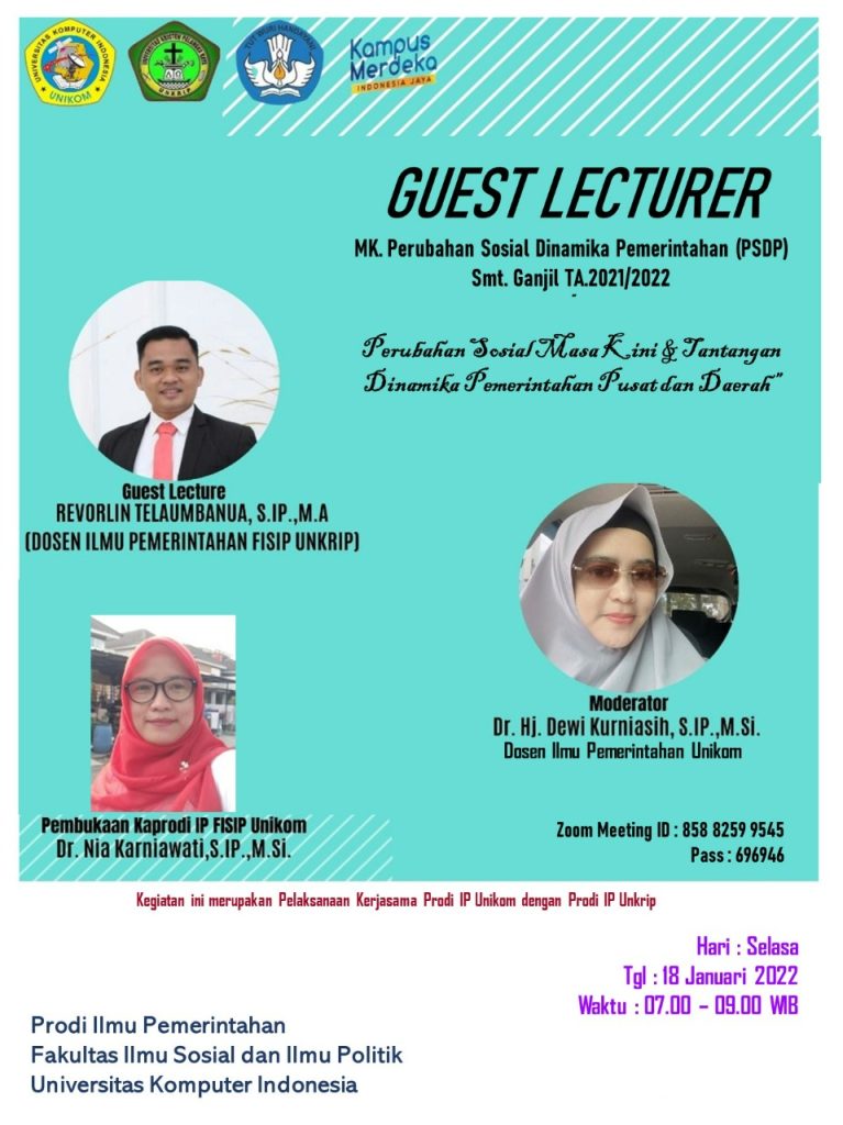 Program Studi Ilmu Pemerintahan FISIP Unikom, akan menyelengaran Guest Lecturer, dalam kesempatan ini terdapat Dosen Tamu dari Program Studi Ilmu Pemerintahan Unkrip.